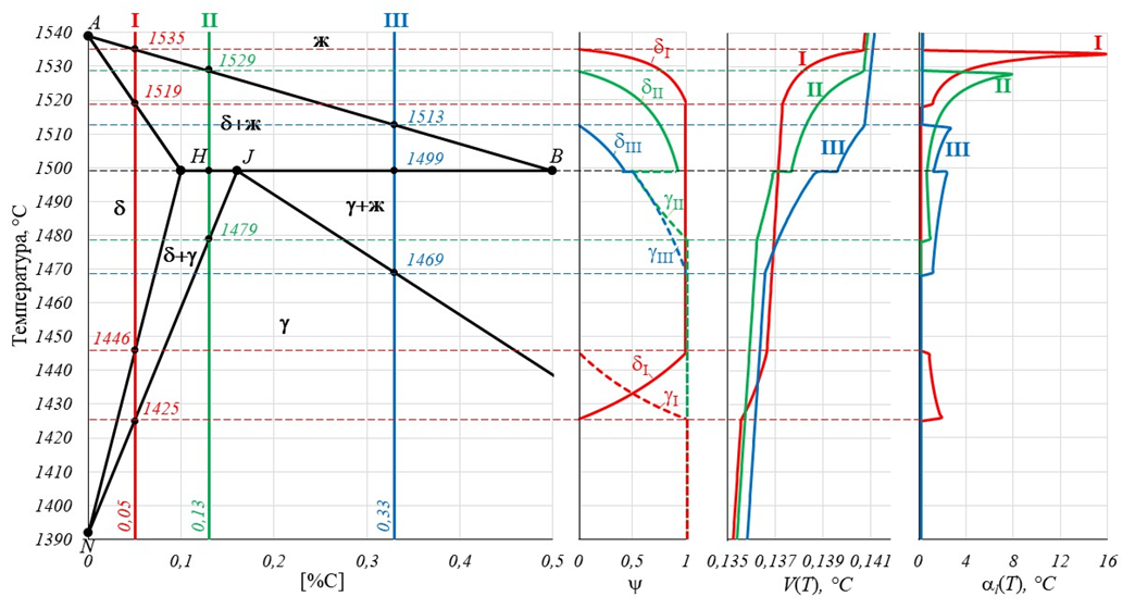 2. Изменения долей фаз , удельных объемов (V) и коэффициентов линейной усадки от температуры в соответствие с фазовыми превращениями в системе Fe-C при содержании углерода в сплаве [%C] = 0,05 (I); 0,13 (II) и 0,33 (III) | |