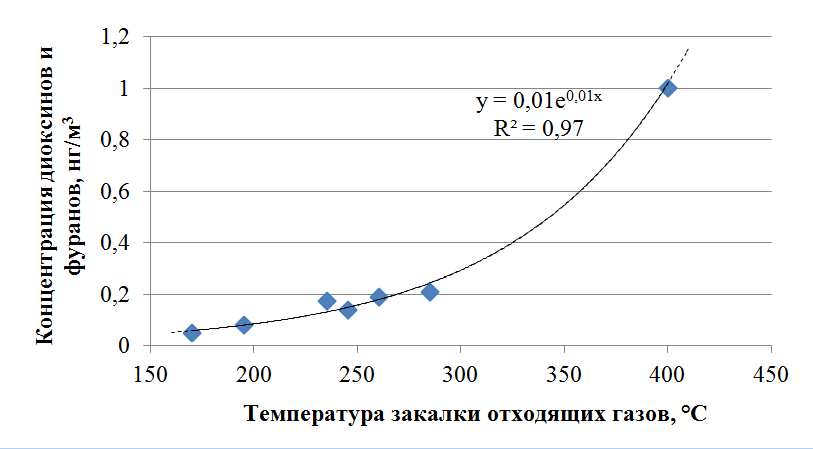 2. Зависимость концентрации диоксинов и фуранов в выбросах от температуры от-ходящих газов после закалки | |