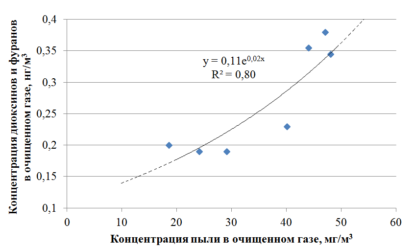 1. Зависимость концентрации диоксинов и фуранов в выбросах от концентрации пыли в отходящих газах после очистки | |
