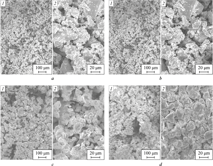 SEM images of the powders of the binary compounds and solid solutions of the studied system are shown in Fig. 1.