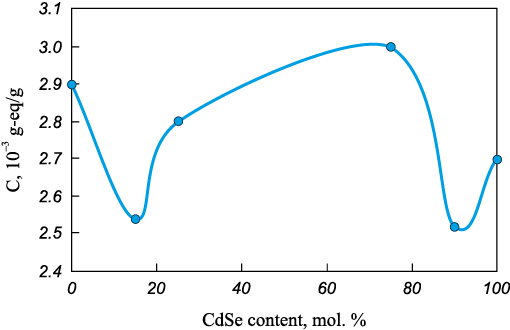 The total concentration of acid centers exhibits an extremal dependence on composition, with maxima observed for (ZnTe)0.26(CdSe)0.74 and (ZnTe)0.68(CdSe)0.32 (Fig. 2). These compositions therefore demonstrate the highest surface acidity, indicating a strong adsorption capacity of (ZnTe)0.26(CdSe)0.74 and (ZnTe)0.68(CdSe)0.32 toward basic gases.