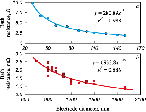 Increasing the electrode diameter in the ferroalloy furnace model results in a marked decrease in bath resistance. To validate this dependence, the parameters of 43 furnaces were analyzed. The power of the furnace transformers ranged from 7.5 – 10.5 to 81 MV·A, while the diameter of self-baking electrodes increased from 750 – 900 to 1900 – 2000 mm.