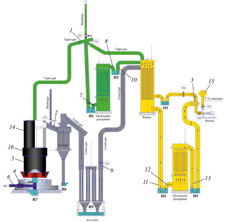 – two SM89 coal gasifiers manufactured in China, each with an inner diameter of 3.6 m, a cross-sectional area of 10.17 m2, and a height of 12.5 m, equipped with a generator gas purification system (Fig. 1);
