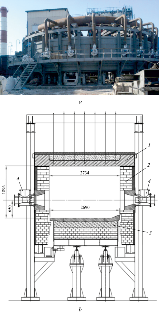 In the 2000s, more than a dozen inventions were developed in Russia related to the production of granular pig iron using annular furnaces with a rotating hearth, incorporating elements of well-known processes such as FASTMET and ITmk3. One invention [3] describes a method for producing granular pig iron by dosing the components of the iron-ore burden to achieve CaO/MgO and SiO2/Al2O3 ratios within the ranges of 2 – 5 and 4 – 6, respectively, ensuring that the primary slag melting temperature does not exceed 1400 °C. Several other patents [4 – 6] focus on the design features of annular furnaces that allow for optimization of heat exchange processes. In particular, patent [6] describes air-cooled suspended screens with vertical movement capability in the briquette loading and unloading zones, and the loading zone is additionally equipped with a device for feeding protective material onto the hearth.