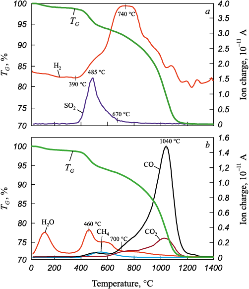 The temperature range up to approximately 550 – 600 °С – corresponding to the first sharp mass loss – was excluded from the metallization calculations, as this process is associated with coal decomposition without interaction with the IOC. This was confirmed by the derivatogram of a separate sample of Cheremkhovsky coal (not shown in the article). Upon heating, the samples released CO, CO2 , H2O, and methane. The CO-to-CO2 ratio in the gas phase is indicative of the metamorphic grade of the coal. The calculations also accounted for the amount of water formed via reaction (3) within the 800 – 1000 °C temperature range.