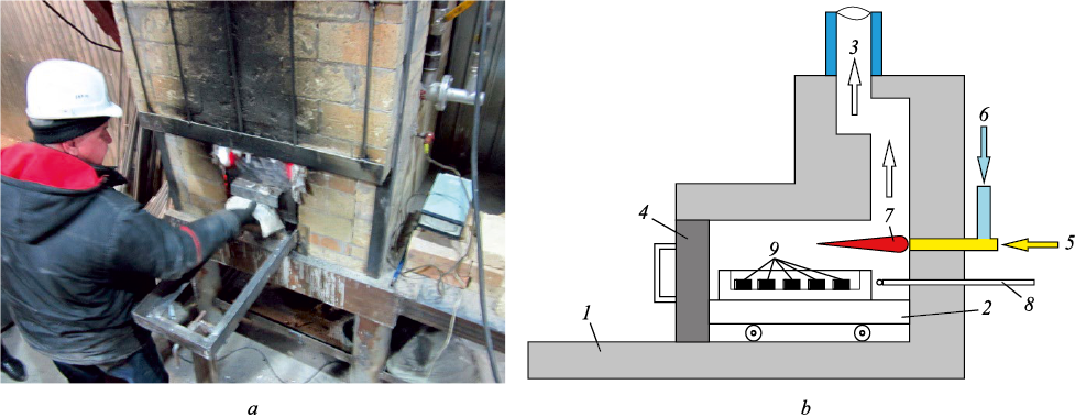 To determine the operating conditions for the pig iron plant under construction, the next stage of the study was carried out, involving the preparation and firing of briquettes composed of iron ore concentrate, coal, and lime under laboratory conditions. A laboratory furnace with a portable hearth (Fig. 4) was designed for this purpose. The furnace is heated using gasified bituminous coal. Its internal dimensions are 500×500 mm in cross section and 650 mm in length. The furnace is equipped with a water-cooled flue gas duct and a forced gas extraction system. A platinum–platinum-rhodium thermocouple was installed to measure the furnace temperature. Before loading the briquettes, the furnace was preheated for 1.5 h to a temperature of approximately 1100 °С.