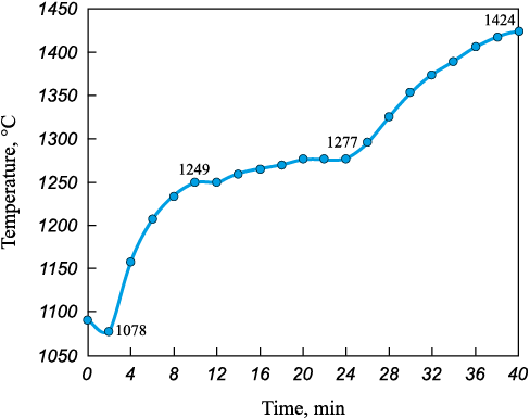 The briquettes were heated to a temperature of 1424 °C (Fig. 6). The initial temperature drop in the furnace to 1078 °C was due to the induction heating period after introducing the cold briquettes. In the second stage, the briquettes were intensively heated to 1249 °C at a rate of 21.4 °C/min over 8 min. The average gas temperature in the furnace during this stage was 1163 °С.