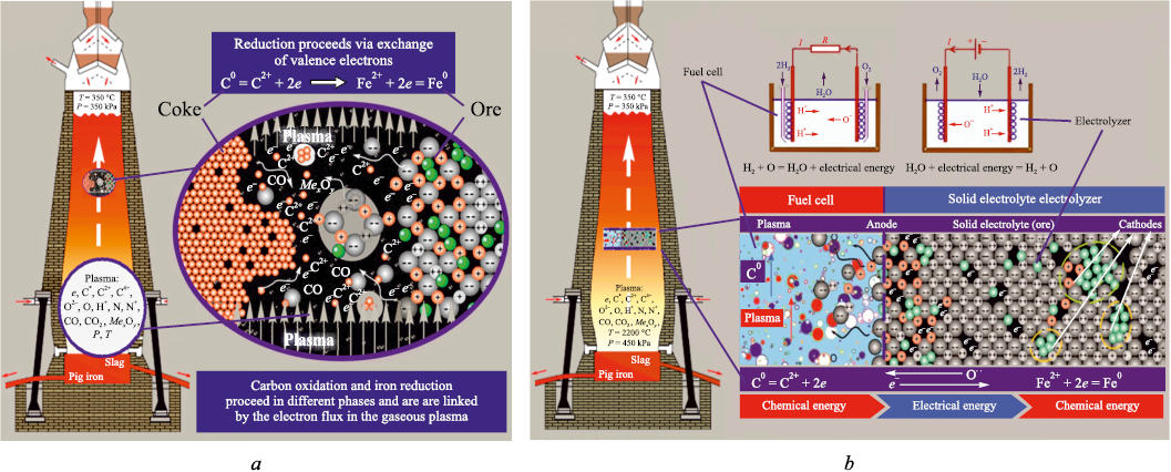 According to the theory, at high temperature and low oxygen partial pressure in the gas phase of reduction units, chemical reactions between solid ore oxides and the solid carbon of coke do not even require direct contact between the solid reagents. The plasma state of the gas phase enables ions and electrons present both in the plasma and on the surfaces of the solids in contact with it to interact over a distance under electrostatic forces, approach one another, and react in the gas phase. This, in turn, allows solid-state reduction reactions to proceed rapidly in the kinetic mode (Fig. 1, a).