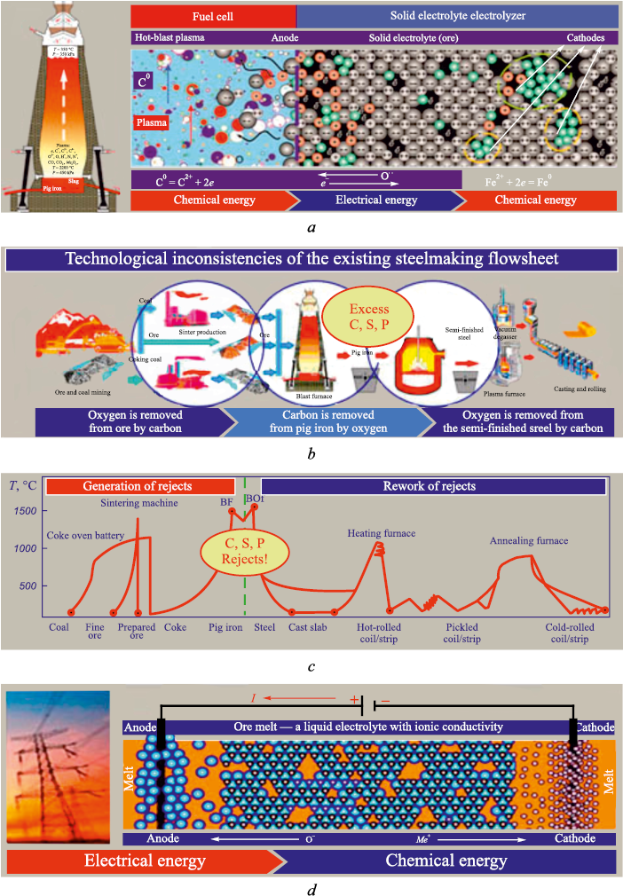 This raises the question of whether the many costly preliminary and intermediate stages of the reduction process are necessary, and whether it is sensible to generate “free” electrons in the fuel-cell portion of ore-reduction units at all. It is evidently far simpler and less expensive to generate electrons not by burning the reductant in metallurgical reduction units, but by modern methods at power plants, transmit them through the electrical grid, and use them directly at the final stage – the reduction of cations – in a specialized electrochemical unit (an electrolyzer). Accordingly, the existing multistage, energy-intensive process of extracting iron from ores (Fig. 3, a – c) should be collapsed to a single concluding stage – electrolysis (Fig. 3, d). In this light, extracting metals from ores by electrolysis appears to be the ultimate goal of transforming current metallurgical technologies.