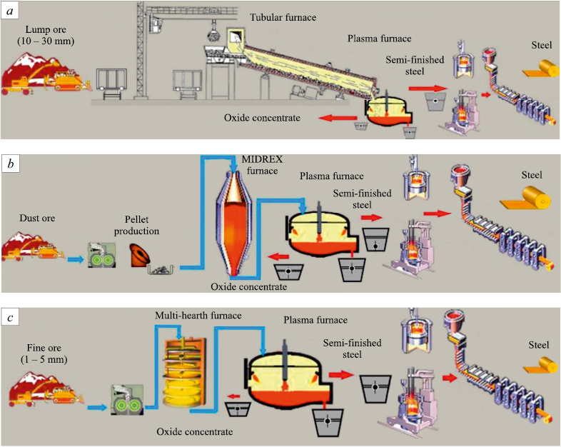 Until now, the rationale for producing pig iron with subsequent conversion to steel has been the enormous throughput of blast furnaces and the availability and relatively low cost of carbonaceous materials used both as a heat source and as reductants. It is worth recalling that this technology arose and evolved historically from the need to rework “defective” product: as the temperature in the bloomery hearth increased and iron became saturated with carbon, brittle cast iron was obtained instead of low-carbon, ductile iron. Producing and then reworking this “defect” proved expedient because carbonaceous reductants were accessible and relatively inexpensive (first wood, then charcoal, and later coal). Today, however, the production of pig iron relies on the most expensive solid fuel – coke, obtained from scarce coal grades by a complex and environmentally hazardous process. As high-quality coking coals become scarce, coke prices keep rising, and meeting ever-stricter quality requirements is increasingly difficult. Moreover, because of how reduction proceeds in blast furnaces, no more than 25 % of the calorific value of this scarce and costly reductant can be used directly: during iron reduction the coke carbon is oxidized only to CO, and 75 % of the energy is released later during non-target “afterburning” of СО to СО2 [17].