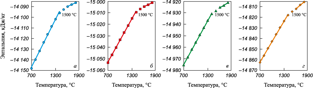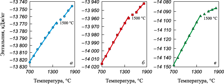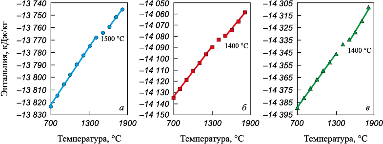 Рис. 4. Зависимость полной энтальпии системы от температуры для шлаковых систем, |