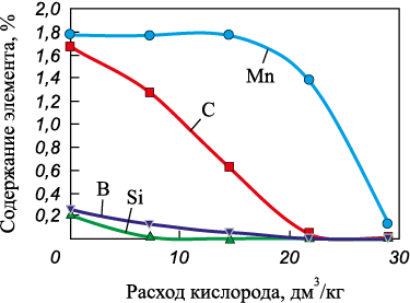 На рис. 10 представлена зависимость изменения содержания компонентов в металле от расхода кислорода.