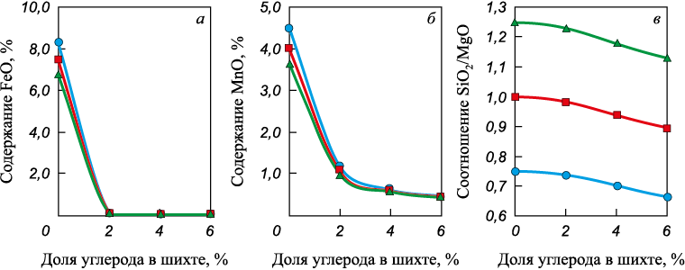 Расчеты равновесия в системах МСК – углерод показали следующее. При наличии углерода в оксидной фазе происходит уменьшение количества оксидов железа, марганца и кремния (рис. 1) и их переход в металл вместе с остаточным углеродом (рис. 2).