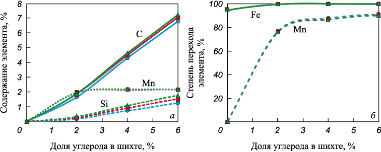 Рис. 2. Зависимость содержания углерода, марганца и кремния в металле (а) |