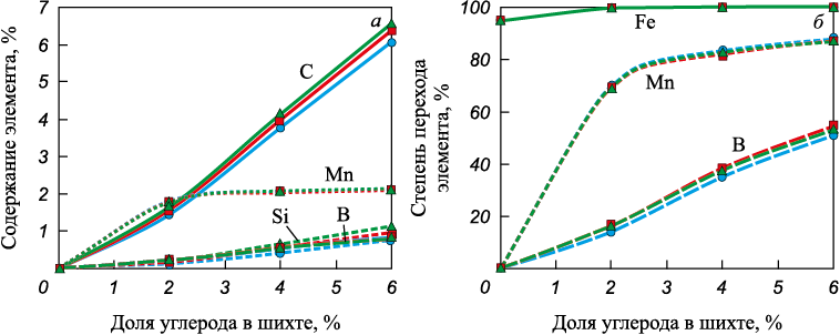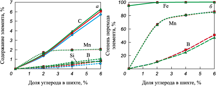Рис. 5. Зависимость содержания углерода, марганца, бора и кремния в металле (а)