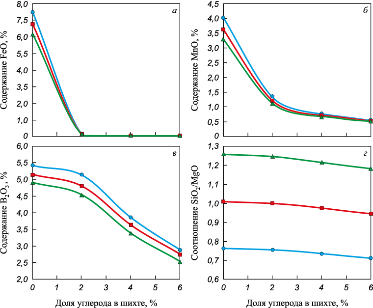 Рис. 8. Зависимость содержания в оксидной фазе FeO (a), MnO (б), B2O3 (в) |