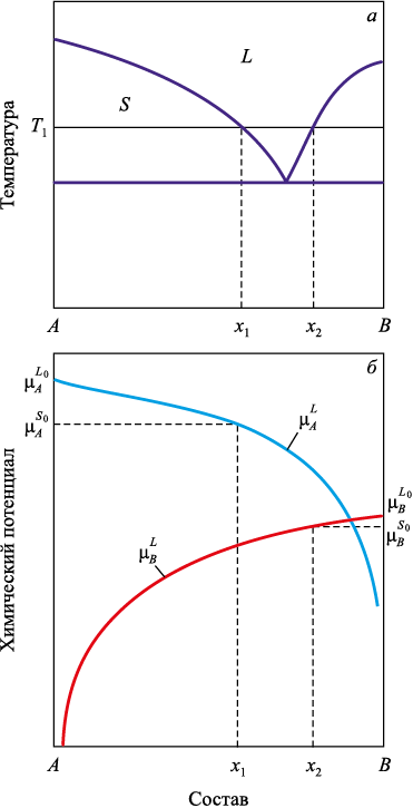 Рассмотрим модельный случай жидкого раствора (расплава) компонентов A и B с равновесной диаграммой состояния, изображенной на рис. 1, при температуре T1 . На основании диаграммы можно сделать ряд заключений о химических потенциалах компонентов фаз. Поскольку при доле компонента B, соответствующей чистому компоненту A, система в равновесии находится в твердом состоянии, химический потенциал компонента A в твердой фазе должен быть ниже, чем в жидкой фазе: \(\mu _A^{{S_0}} < \mu _A^{{L_0}}\). Обозначим символом x долю компонента B соответствующей фазе и проведем, в соответствии с приведенными выше положениями, линию \(\mu _A^L = \mu _A^L(x)\).