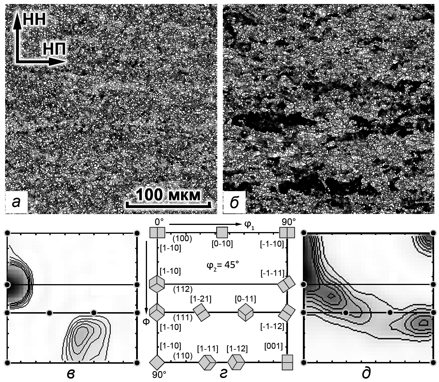 1. Рисунок. Текстура листов трубной стали типа 06Г2МБ после TMCP не склонных (а, в) и склонных (б, д) к образованию расщеплений. | |
