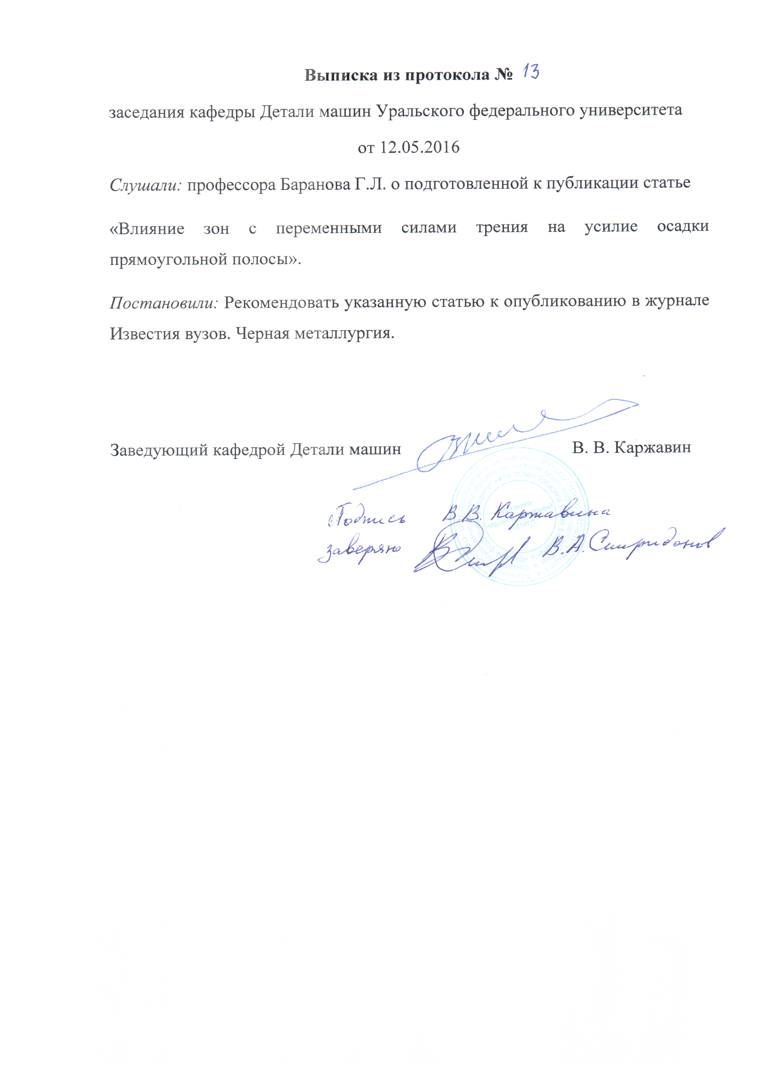 13. Baranov G.L. Analiz kontaktnyih napryazheniy v zone ochaga plasticheskoy deformatsii so znakoperemennyimi silami treniya // Izvestiya VUZov. Chernaya metallurgiya. 2015, tom 58, № 3. P. 192–195.